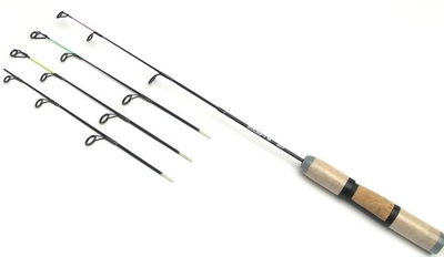 wędka podlodowa 4 w 1 ; z czterema różnymi wymiennymi szczytówkami ( w tym na kiwok ) ; korkowa rękojeść ; długość : 42 cm; 55 cm