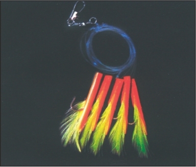 Zestaw dorszowy tuba z piórkiem przypon: 0,6 mm, trok: 0,5 mm, dł. zestawu: 80 cm, dł. troka: 15 cm, hak: 2 0, kolor: tuba japońska czerwień + żółte piórko.