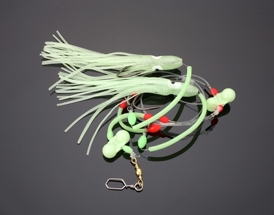 - Świetny zestaw do połowu zębaczy i dużych brosm. Duże obciążenie (300-800gr w zależności od dryfu i głębokości) powinno co jakiś czas silnie uderzyć w dno, aby sprowokować ryby do brania
