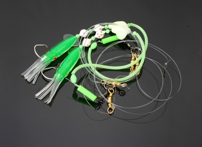 Holger zaprojektował ten zestaw jako uniwersał na płytkie wody- świetnie sprawdzi się przy połowie morszczuków, dorszy, brosm i molw. Obracające się fluorescencyjne koraliki tworzą falę hydroakustyczną, która po odebraniu przez linię boczną ryb szybko ściąga je w pobliże przynęty. Zestaw polecany na głębokości od 5 do 50m.